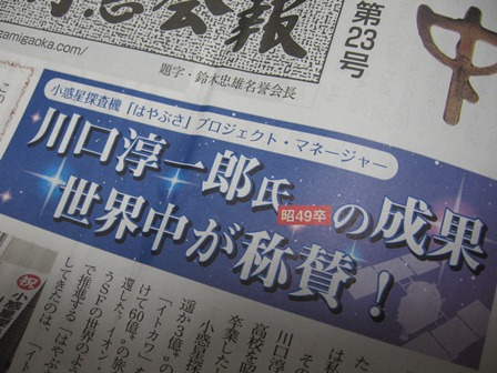 朝寝坊から始まり、ぐうたらな生活をしていました。新聞の一面には、「鉢呂氏辞任」の文字が・・・・。どうしちゃったのでしょうね・・・。被災地の人たちをどう思っての発言だったのか、そして「放射能うつしちゃうぞ」はないですよね?人間の言葉ってのは、ちょっとしたことで人を傷つけ、ちょっとしたことで信頼を失うから怖いですね・・・。まして、責任ある立場の人間ってのは決して調子に乗ってはいけない・・・。信頼ってのは一番重要なものですよね・・・。鉢呂さん・・・残念です。オイラも気をつけます・・・(^^;) きょうは時々日が差すもののすっきりしない天気で、外出する気にもなれず・・・・・朝から夕方まで部屋の片づけ・・・貧乏性なのでなかなかゴミが捨てられず・・・・こんなのが出てきました。高校の同窓会報・・・・小惑星探査機「はやぶさ」のプロジェクト・リーダーで知られる川口教授・・・・、実はオイラと同じ高校を卒業してたんです・・・(汗)昭和49年卒とのこと・・・・その後、京都大学工学部卒→東京大学大学院→米国航空宇宙局→宇宙航空研究機構という略歴。すごいなぁ・・・・。オイラの母校の卒業生には、超有名な作家が何人かいるほか、有名人が通う病院の医師、某テレビ局の女子アナと著名人が多いんです・・・・。それに比べオイラは何やってんでしょうね・・・・(--;)何か一発デカイことやってみたいですね(笑) 夕方、札幌ドームに行ってきました。いろいろと売れてましたね・・・・・プリンターは一台もなくなってました。なんであのプリンターやあのプリンター買うかなあ・・・・(^^;)と思いながら、オイラも衝動買いしました。なんで買うかなあ・・・・(笑) 買ったもの?内緒です(笑) スマイレージっていう女の子たちのLIVEトークショーやってました。誰?オジさんはついていけません・・・・(^^;) さて、明日からまた仕事ですね・・・・。今週は忙しくなりますが、がんばります!