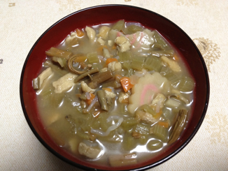 津軽の郷土料理けの汁(^_^)粥の汁が訛って、けの汁になったらしいです。コメが食べられなかった時代に、野菜を細くきざんで粥のようにみたてたとのこと。栄養豊富でローカロリー、食物繊維も豊富でおいしいんです\(^o^)/ おいわき山の画像をアップしようと思ったのですが、原因不明でアップできず(ーー;)後日アップします(汗) さて、今年もあと3時間で終わりですね(^_^;)いろんな人たちにお世話になって感謝してます!そして、いろいろなことがあったけど、無事でいられたことにまずは感謝しようと思います(^_^;)来年もみなさん無事でいられますように!よいお年をお迎え下さい!来年もよろしくお願いします!
