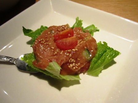 ノー残業DAY・・・ということで、大通り公園方面にGO!もちろんクーポン持って・・・(笑) マグロの葱とろユッケ・・・。口の中でトロけて行きましたよ~(^^)思いっきり、わさび醤油かけて、ご飯と一緒に食べたかったなぁ・・・(笑) 若鶏のレモンソテー、そして串焼き三種・・・。バランスいいですね~おいしかったです(^^)v 写真はありませんが、「水菜とトマトのサラダ」のドレッシングが絶妙・・・(^^;)この店で一番おいしかったかもしれません(苦笑) 大通り公園からススキノまで歩き、創成川沿いにあるカフェでスイーツをいただきました。クーポンがあったので・・・(^^;)飲んだあとは、ラーメンかスイーツですよね・・・(苦笑)大脳が欲しがってるんです・・・(^^;) 最終バスで帰宅・・・(^^;)健全な飲み方でした・・・(苦笑)これぐらいの飲み方がいいのかなぁ・・・。明日が楽だし・・・よかったよかった(^^;) でも、もう0時30分過ぎちゃいました・・・(汗)明日に備えて寝ようかな・・・(^^;)