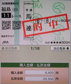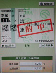 今年も秋華賞の日となってしまいました・・・(^^;)馬券検討・・・・(--)いろいろと考えましたが、ガチガチの1番人気の4番ヌーヴォレコルトは外せないだろうなあ・・・。相手探しですが、3歳牝馬なので順当には決まらないような気がします。 そこで、オイラが友人Yさんと電話でおしゃべりしながら考えたのは・・・きょうの日刊スポーツの一面に・・・「9年ぶり日本S」「虎」「原巨人粉砕4連勝突破」「史上最大の下克上」と・・・阪神、いいっすね~(^^)vってことで、4番と9番は外せない。 そして、勝負服は虎の縦縞・・・1、5、18。袖が縦縞・・・2、14。 秋華というくらいだから、イメージはコスモス・・・。ピンクの勝負服4、11、16と桃色の8枠16、17、18。 整理すると・・・1、2、4、5、9、11、14、16、17、18の10頭が候補・・・(苦笑)買い目が多すぎるなあ・・・。 昨日18日に、日本S出場を決めた阪神のユニフォームは白(1枠)と黒(2枠)でした。下克上という意味合いからも1枠1番ブランネージュは「あり」ですね(爆)阪神カラーの5枠(黄)9番アドマイヤビジンの父はクロフネ・・・おおスゴイ(爆) ってことで、買い目は・・・ 3連複軸2頭流し1、4-2、5、9、11、14、16、17、183連単4=1-9、18ダメだこりゃ・・・(汗) *****************************************ふざけて買ってはいけませんでしたね・・・(汗)強い馬、調子のいい馬が勝つのです・・・(--)真面目に狙った福島メインは的中(^^)v 福島最終も100円ですが的中・・・ちなみに8230円の配当(^^)v 来週はキチっとG1狙います(苦笑)