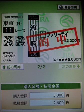金曜土曜と飲み会で・・・二日酔いで馬柱を見ることほど辛いものはありません。面倒だけど、オイラの不的中を楽しみにしている人もいるので(笑)さて、いつもどおりかなり悩みましたが・・・今回は珍しく1番人気から(苦笑)18番ヌーヴォレコルト の単複。3連複18番流し、相手は2,5,6,8,10,12。的中の予感(笑) ***************************************************蝦正さんのマリアライト、つよかったなあ。 オイラは単勝はハズレましたが・・・複勝と3連複的中で、今回も少しだけプラスです(^^;)最終レースには手を出さず(笑)プラスのまま来週を迎えることにします(^^)