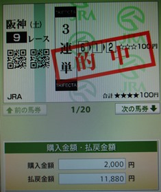 3歳馬、1番ノンコノユメ・・・気になりますね。ってか、がんばってほしいのですが・・・。450kgの馬体ですが・・・500kgを超える古馬との対戦・・・しかも負担重量が古馬と1kg差の56kgってどうなのでしょうね。でも前走は58kgで突っ込んできたからなあ・・・(^^;) いろいろと悩みましたが、今回もオイラ理論と過去のデータで7頭が浮上・・・あとは展開ですね。武豊騎手が自分のペースで持ち込めればコパが勝てるかもしれませんが、コーリンベリーが競る形だとホッコーが好位から差すのかな? 軸は13番ホッコータルマエ対抗は7番コパノリッキー抑えで、1番ノンコノユメ、2番サウンドトゥルー、4番サンビスタ、11番コーリンベリー、14番ガンピット 間違いなくプラスにするには、コパノリッキーの複勝1点買い・・・かな?(^^;)でも、それじゃあツマラナイので・・・3連単 軸2頭マルチで7=13-1,2,4,11,14 そして、土曜日の阪神9Rで万馬券的中で、ちょっと余裕・・・(^^) コパとホッコーが倒れた場合を想定し、社台の馬を中心に・・・1番ノンコノユメ流し1-6,8,9,12,16で遊んでみましょう!楽しみですね! *************************************************う~ん・・・組み合わせ次第では、ゲットできた30万馬券だけに、くやしいですね・・・。あくまでもヒモだと思っていた牝馬サンビスタ、そしてノンコノユメ・・・。強かったですね。デムーロの騎乗が上手ってことですかね・・・。外国人騎手でのワンツー・・・。買えない馬券ではなかったのですが・・・ コパとホッコーを軸としていたから、タラレバの話か(苦笑)残念です。でも・・・ 阪神メインの万馬券をゲット! 買い忘れた~と買い足した同じレースの100円馬券も・・・もちろん万馬券で・・・ヤバいですね・・・。来週も楽しみます!