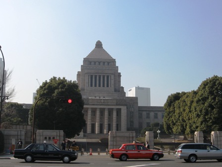 会議に出席したメンバーと見学に行ってみたが、国会開催中のため見学できず。正門にいた警官が「裏側の参議院なら見学できるかもしれない」というので行ってみたが、やはりダメだった。国会議事堂で昼食を食べてみたかったのだが、残念・・・・。
