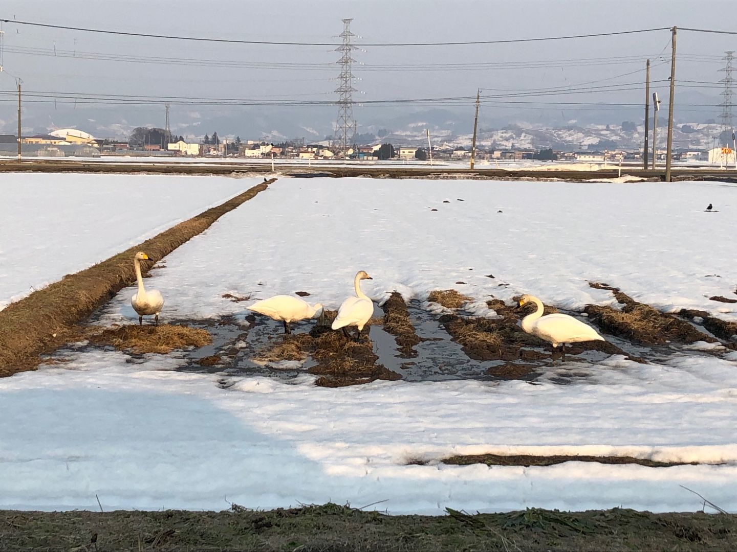 雪どけが始まった水田に、白鳥が降りてました。