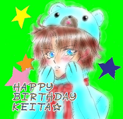 今日って、啓太の誕生日でした、よね・・・(あわわ;;;)色々サイト巡りしてて、そうだったよっ!!と大慌て☆・・・別に忘れてても良かったんだけどね・・・(=_=)て事で。何故、自分の誕生日にクマを着てるのか、とか。そんな細かい事、聞かんで下さいよぉ・・・(;_;)<ちなみに和希の手作り☆皆、可愛い啓太と一緒にクマ描いてるけど。ここでフツーにそーゆーのにしたら関西人として(以下略)大慌てで描いたので、ホントに雑です・・・未だにペンタブ買い直してないので、これ以上の作業はムリです・・・とりあえず、おめでとう!って事で。・・・理事長の誕生日までにはペンタブ買おうっと・・・<かなりヤル気(大笑)