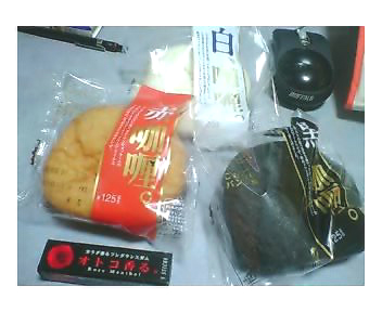 アホ丸出しのお買い物。全種類。ファミマで買ってきた。やっとオトコ香る。は関西でも売り出したようだったので、話の種に、と。カレーパンは、多分、自分としては黒が一番好みではないかと思います。これと一緒に「辛口カリビアンシーフードヌードル」が今日のアチキの夕食です★(笑)さて、赤と白はいつ食べよっかな。。。♪