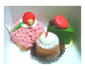 梅田大丸のみに出店している、芦屋の「L'ASIE」のケーキです。アチキはここの焼き菓子が大好きなんですけど、生ケーキはあまり食べた事がなく。新作の焼き菓子を買った後で、フラフラとショーウインドゥを見てて、何となく。。。(笑)もっと種類はありますが、そんなに食べられないので一応3つだけ。左奥のピンクのは、ストロベリーのムースとスポンジ、だったかな?見た目で選びました。右奥は抹茶の下がフランボワースのムースらしい。同じくフランボワーズのマカロンがアクセントです。んで手前が、その名も「プリンが入っています」というケーキ。外はキャラメルなんですな。んで中にプリンが入ってて、そのままで焼いてある、という変り種です。小さいけどめちゃうま★お値段も200円しないというリーズナブル♪クリームの上の赤いのはクコの実。このお店はアジアンテイストがモチーフなので、焼き菓子にも生ケーキにも羅漢果とかレッドペッパーとかクコの実とかを良く使ってます。でもそんなに嫌味じゃなくて美味しいの★包装紙とかパッケージもすごくオシャレで可愛いのでお気に入りです^^あ、何の為に買ったかというと、和希のお誕生日だったから(笑)でも食べるものが多くて結局昨日食べなかったの。賞味期限と戦いながら完食目指します~♪