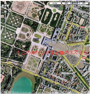ワタクシ、これまで見たことなかったのですが。うちの会社の系列会社の某地図の検索作業をやってる時に、ふと、「グーグルアース、っていうのがあったよね~」と思い出したので、ちら、と見てみました。フィルター掛かってるのか解らないんですけど、日本の部分を超拡大すると、『この部分の表示は出来ません』て出たので、じゃあ外国だったらどうよ、と色々見てたんですがね。そー言えば、某番組で、「ベルサイユ宮殿の庭園の模様が、某ネズミーランドの富士額ネズミに似ている」とか言ってたので、調べてみよう、と。パリまで行き着くのが大変でしたが(笑)、何とか見つけました。それが、上の地図です★ちょっと左上側で、斜め向いてるんですけど(笑)ホントに似てる~(笑)最初に見つけた人、スゲェな!!ルイ14世の時代に、富士額は居なかったのにね。何たる偶然!!ヒマなときは色々探してみようっと★おもしろ~い♪