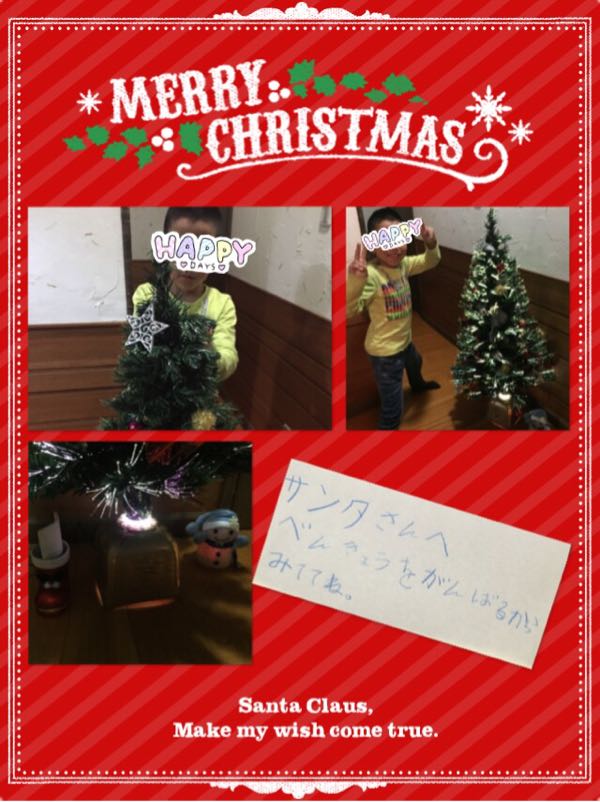 ちょっと早いですが、クローゼットの片付けをしたのでクリスマスツリーを出しました。 毎年恒例のサンタさんへ書いたお手紙を夜のうちにツリーの下の長靴に入れておいたら朝には失くなってて息子が「サンタさん、もう来ちゃった!」と大喜び♪ 「きっとツリーがピカピカしてたから、サンタさんがすぐ気付いたんだ!」 (=´∀`)人(´∀`=) あと何年、こんなやり取り出来るんだろう。(笑)