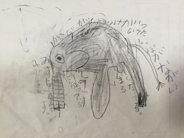 “知らせたいものの絵と見つけたことをかこう!”という授業で動物園に行って描いてきた息子の絵。 『アジアゾウ』 まぁ、長い鼻があって…うん、ゾウだ! 「みずをすってみずをだす」 「からだがふとい」 「けがついてた」 「しっぽがながい」 うん、うん。 「まるくなってる」 「とんがってする」 もはや何のことかわからない。(−_−;) でも、このツッコミどころ満載な絵のセンスには私のDNAを感じる。σ(^_^;)