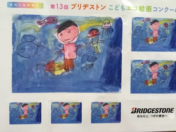 息子が学校で『わたしのだいすきなしぜん』というテーマで描いた絵です。 ステッカーになって配布されました。 息子いわく「海で友達と遊んでる絵を描いた」 のだそうです。 この授業があった日の朝、「だいすきなしぜんって何を描いたらいいの〜?」と泣き言を言ってた息子。 そもそも自然って何さ?状態だったらしく、「自然ってね、海や山や川とかの事だよ。息子君が遊んで楽しかったこととか描いたらいいんだよ」と教えたものの内心では大丈夫なんだろーかと心配してた私。 ちゃんと描けてたようで安心しました。 (^^;;