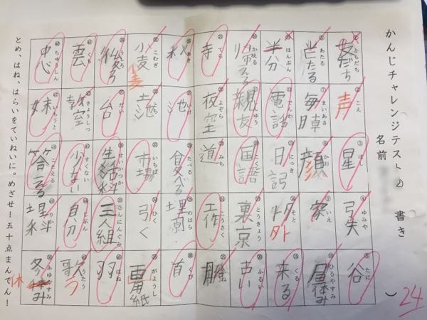 冬休み前にやった漢字テストが50点満点中24点でした。 休み明けにまた同じテストをして、45点以上取れたら合格。 合格するまでは何度でも再テストをすると聞いてこれはヤバイぞ!と、冬休み中は毎日漢字の特訓しました。 1人でやらせると書き順もめちゃくちゃだし、本当は1本の線なのに2本に分けて書いてたりとスゴイ事をするので漢字のプリントをやる時は隣りでチェックして、間違えたり書き順が違う度にスマホの筆順アプリで確認させてから書き直すようにしました。 そして休み明けのテスト。 なんと50点満点!! 1回で合格出来ればいいんだけどと送り出したものの、まさか満点取って帰ってくるとは思ってなくて…Σ( ̄。 ̄ノ)ノ 息子が「俺、毎日漢字頑張ったからねっ!」と笑顔で報告してくれました♪ 目で見たモノを記憶して処理する事が苦手な息子は漢字を覚えることも決して得意ではないはずなのに、本当に頑張ったね! ╰(*´︶`*)╯♡