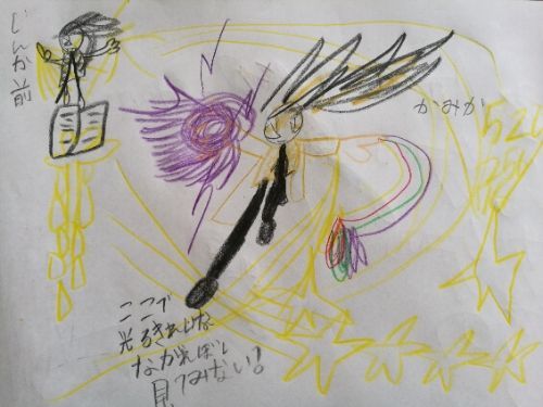 息子が楽しそうに描いてる落書き帳を覗き見。(笑) 『ここで光るきれいな流れ星 見てみない?』 なんかの必殺技だろーか? ( *´艸`)