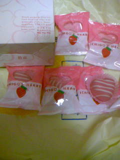 火曜日 いい感じで お仕事できました~バイト仲間から お土産がいろいろ(^_-)-☆ 東京に行ってた仲間からは 直接 いつもアリガトウと言って いただきました~ いちごハート銀座いちご座 いちごハート と書かれています♪ ピンク色で ハート型で カワイイ(^o^)/ 味もいいですよ~ 苺味のケーキ風 程よい硬さの 口当たりでーす アリガトウm(__)m こちらこそ 明日は 水曜だけど 夜勤もしまーす お休み 多かった分頑張って働こう !(^^)! ネットで注文した 日用品が 明日指定の時間に送ってくる予定 日用品の購入は初めての試みでーす(^^)v では お元気でね~