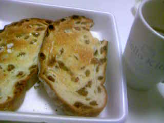こんばんは♪ 日曜日でしたね皆さん いい休日でしたか~ 私は 夕方まではオフで その後は 頑張って働いてきましたよ~ 今日は 近畿も梅雨入りしたらしく 朝から雨模様これから 一ヶ月以上 雨とのお付き合いは続きますね~ 今日はそんなに降ってないけど(^^) 今朝 知人が訪ねて来て 一緒に買い物でも行こうって事で ショッピングを楽しんできましたよ♪ 私は 昨日も買い物したし ネットでも注文もした後なので 今日は 見て楽しみました。 知人は 靴とか買っていたわ~♪ 午後から 時間もあったし 久し振りで実家に行ってみました。 父母と一緒に 昼食をして おしゃべりにも夢中になったし 楽しい時間はあっという間ですね~ 帰宅後 夕方 バイト行くまで 余裕もあり家事を済ませ お昼ねもできて 幸せ~でした(^_-) (休日の醍醐味だー) ア 昨日食べた レーズン入りのパンが 美味しかったのでUPしますネ 端っこかじって 失礼(*^_^*) 美味しいので写メ撮ったので。トーストして マーガリンつけました いける~♪ 知人は 何もつけなくても 美味しいと言ってましたよ~(^o^)/ では 明日から又 頑張って! お互いにネ