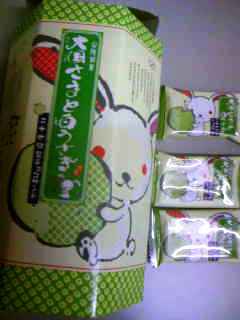 火曜日でした 暑かったですねバイクに乗るときも 上着なしで 薄着になった通勤で 日焼けしそう 、ま 通勤の時以外 バイト先の店内にこもってるから 必要な太陽光線かも(^^ゞ 今日も バイトでは出来る限り 頑張ったと思う。この調子で 力を出していけたら いいな(^_-) 知り合いから お土産をいただいたので 画像UPしますかわいい箱に入った 大国さまと白うさぎ という名前の御菓子です。 山陰銘菓となってます ウエハースを硬めにしたような歯ざわりで 20世紀梨の味がして とても美味しかった♪ これは お土産には 喜ばれますわ。 アリガトウm(__)m この絵もカワイイ 大きな耳の 白うさぎが 両手で大きな梨を持ってる。 ほのぼの~ さ 明日は どんな日かな 皆さん 暑中 ご自愛くださーい(^_-)