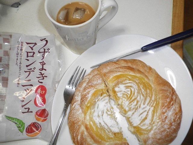 かなり涼しいですね今夜からは 寝具は暖かくしないと、もう 薄手の肌布団では寒すぎる~(^_^;)昨日は 娘が夕方から車で ちょっと誘ってくれた。ケー君のお散歩もいつも通りできたし 平穏でした。ニュースでは 新幹線が停まったり。 数日後 又 新幹線に乗るつもりなので 気になったりしまーす。 今日は ケーキが食べたくなった。 ホイップのではなく バタークリームのが(^^ゞ 何故だろう。 以前買ったことのある スーパーに ウォーキングを兼ねて行ってみた。でも シュークリームやエクレアばかりで 無かった。 それで 目についたのがこれは パン なんですが、 マロン に惹かれて(^_-) レンジで 40秒ほど温めて いただきました~すっごく美味しい♪ マロン マロン だったかな、 あれも美味しいけど こちらのデニッシュもイケますよ~(^_^) では 明日も お元気で~