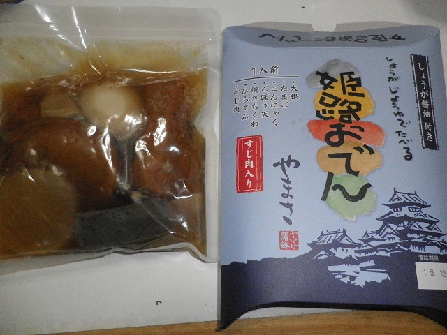 こんばんは~遅い更新です。 この時間が一番ゆっくりできるので(^_-)何故って この後仕事がないので( 後は睡眠 ) 今日は職場で インフルエンザの予防接種を受けた。何と 私は数十年振りの接種でした。 学生の時以来?! 記憶があいまいだけど きっとそうだと思う。 さて 何か画像UPしようかな 友人が 姫路に行ったお土産名前もそのままに 姫路おでん美味しいおでん でした♪ 夕食の一品にできたので家族でいただきましたm(__)m こういうお土産もいいですね。 では この辺で~