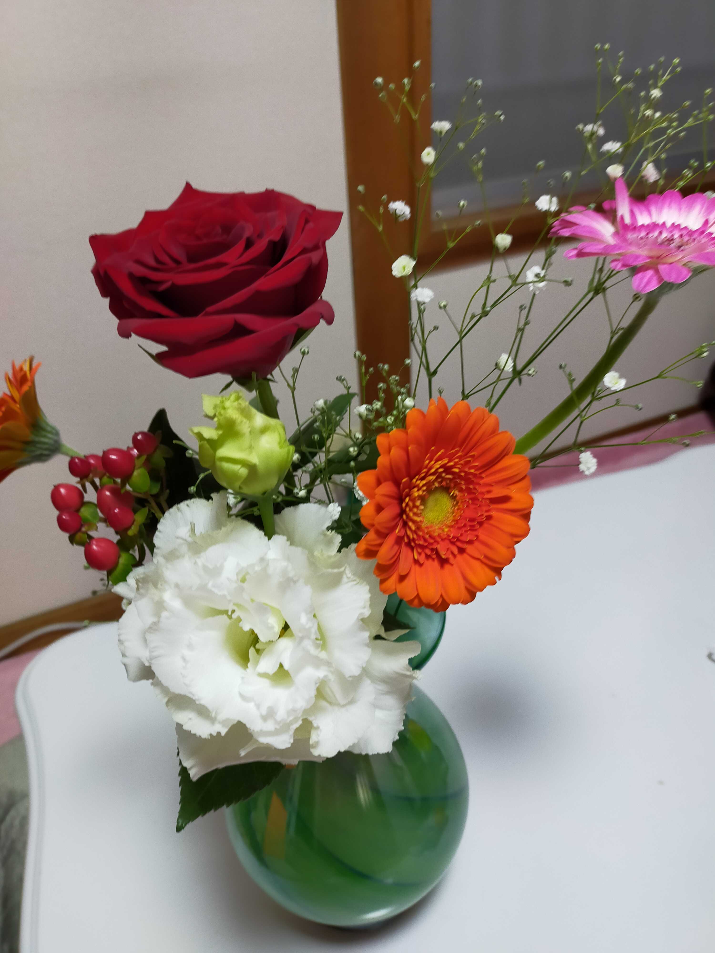 こんにちは♪昨夜が、私の老人ホーム勤務最終日でした。嬉しいことに、数分間主役になりました(笑)数人のスタッフを集めて、施設長の司会で、進められたのは、この8年間の私への感謝の言葉や、これからの励ましや、花束贈呈、記念品、皆さんの書いてくださった色紙など。その後、皆さんと写真撮影(^o^)ほろりとくる涙を抑えながら、私からも一言お話しました。ほんと、ありがとうございました。いただいた花束は、2つに分けました。