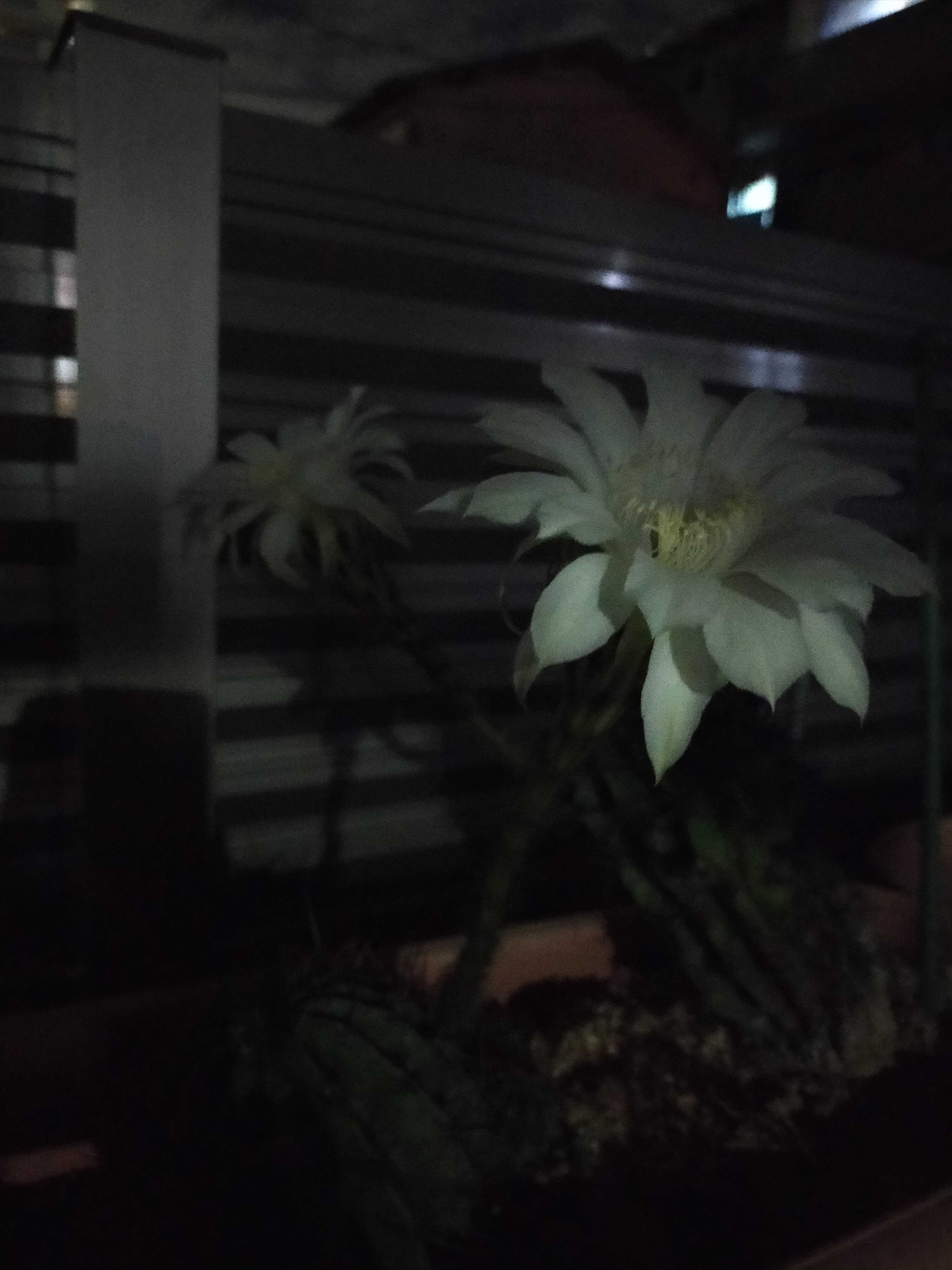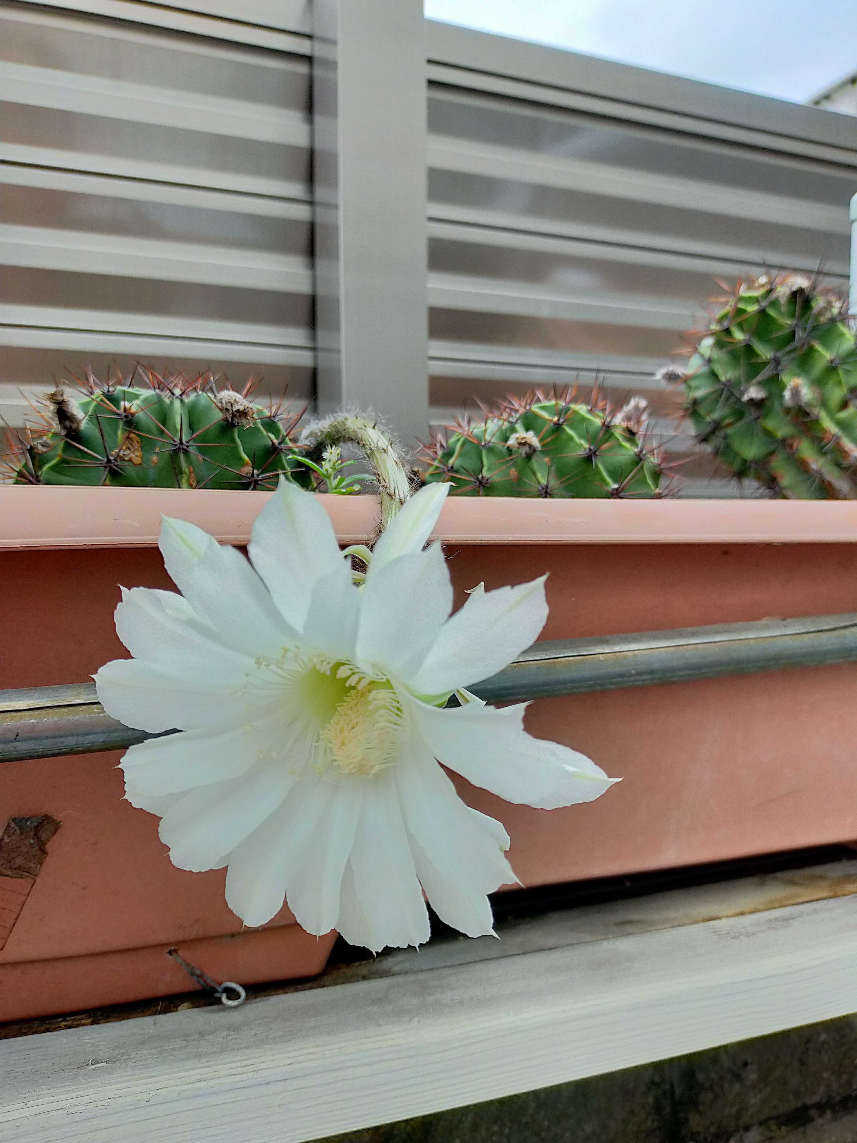 こんばんは~♪遅い日記です。昨日 夕方からお出かけして 他府県で一泊してきました。 久しぶりで 嬉しくて リフレッシュできました~('_') 昨日 仕事後電車で出かけ 目的地に着くまでにアクシデント! この電車は 夕方の大雨のため○ ○駅から ○○駅まで 運休中 です と アナウンスあれ~! と思ったけど 混んでる 乗客は 皆さん冷静で誰一人 ざわついていなかった。 私も 駅まで車で迎えに来てくれる知人に ラインしたりして、、、結局 いつもより 40分位時間かかり到着できました。 知人が 駅に問い合わせて 既に 運休は取りやめ と教えられたそうだけど、 車内の乗客には その後 5分以上後に アナウンスされた。 あ~良かった~しかし 数百人の方が 私と同じ駅で 下車されてたけど皆さん もし 運休だったら どうされるつもりだったのかと不思議に思いながら 降りたのでした~ ちなみに もし 最初の運休期間を タクシーに乗ってたら7000円ほど。(スマホ調べ) 今夜 帰宅後 サボテンの花が開花してました❀ m(__)m 暗いけど どうぞ('_')