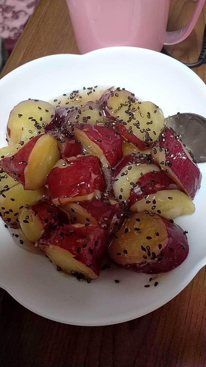 こんにちは~♪今日ものんびりできてます。 数日後 温泉の予約してるので 楽しみ~('_')車で連れて行ってもらえるので それも嬉しい♪又 行った後で 日記書きまーす。昨日作ったおやつのご紹介 炊飯器で作った 私流の大学いも です。友人宅に行ったとき 食べて 美味しかったので作り方聞いていた。 それを うちにある材料でアレンジして作ってみました~ 美味しくできて良かったです。又作ろうっと!(^^)!ではこの辺で~ (@^^)/~~~
