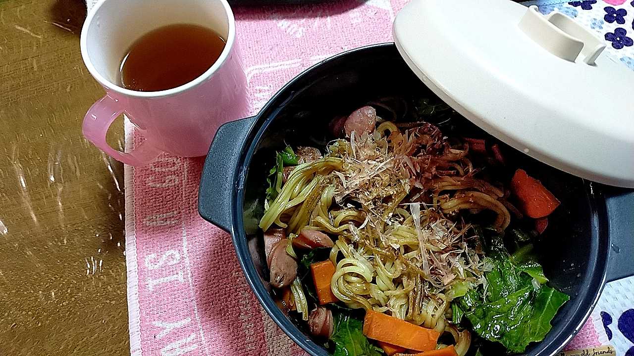 こんにちは~♪実験の気分で 作ってみましたー レンジ用のお鍋で 焼きそば作ってみた。結論 とても美味しくできた~♪ このお鍋に カットしたキャベツ 人参 ウインナーを入れ 上に焼きそば そして ソースの粉末を散らして レンチンだー!(^^)! 五分くらいしたかなすると 美味しくできました。 出来上がりに カツオ振りかけた。 満足して 今 食べながら日記書いてまーす。又 何か作ったら 載せようかなぁではこの辺で (@^^)/~~~