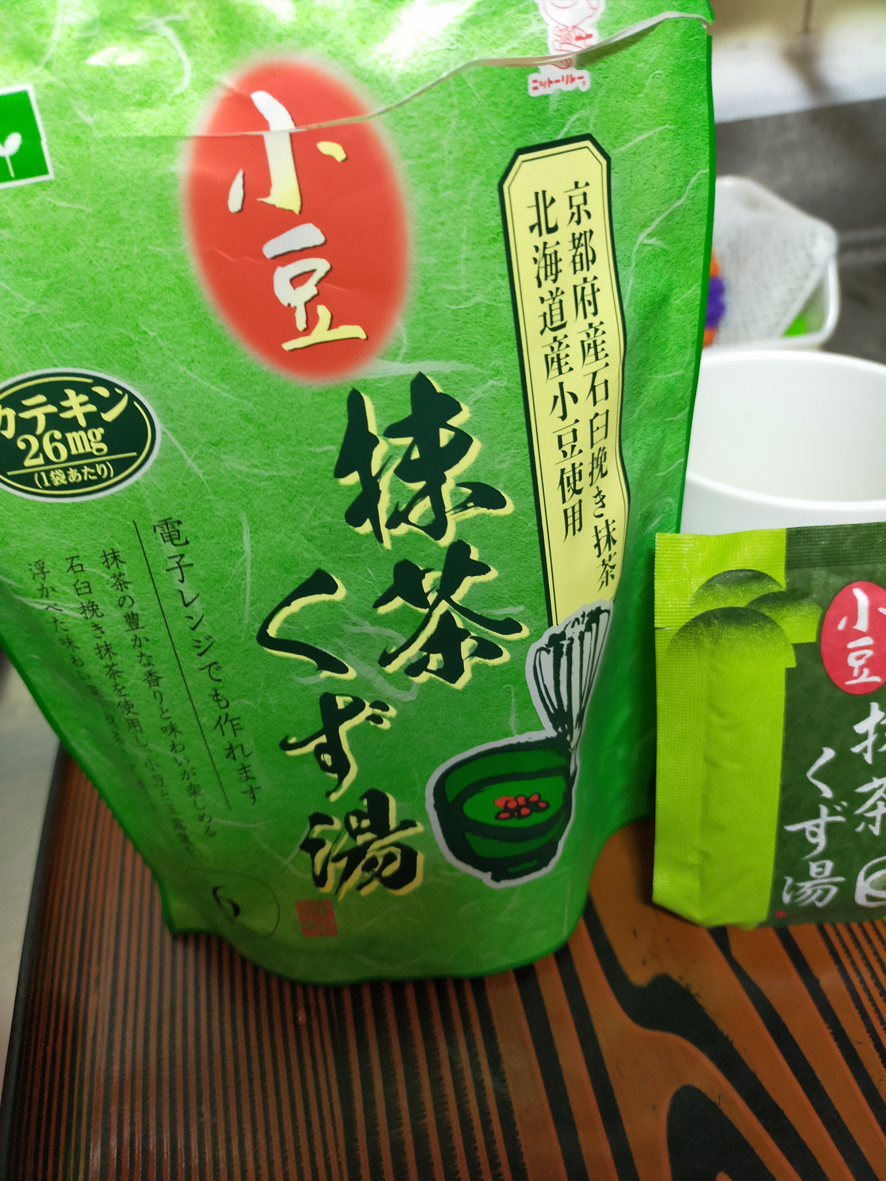 おはようございます♪ かなり寒さを感じるこの頃ですねーエアコンも暖房入れて 大活躍!(^^)!昨日 今年最後に 歯のクリーニングしようと歯医者さんに電話したら、 半年に一度でいいので 来年の二月か 三月に来てください と。ありゃあ びっくり。 ま いいけど(*^^)v こういう品を見つけたので買ってみた。葛湯好きなんです。抹茶味だし👍6個入りで420円なので 一個70円 高級だなぁ笑 でも 美味しかったので良し! 温まるし 又 飲むのが楽しみいぃ♡ではこの辺で~ (@^^)/~~~