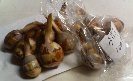大晦日です。早いもので今年もおしまい。晩は好例の御節を作るんだけど、昨日の帰り道、道端の無人販売所でこんなものを発見w慈姑(クワイ) …漢字、今知ったw今まで食べたことあったかな??料理するのは初めてです。芽を残して六方に皮を剥くんだけど、イビツなだけに難しかったよ。