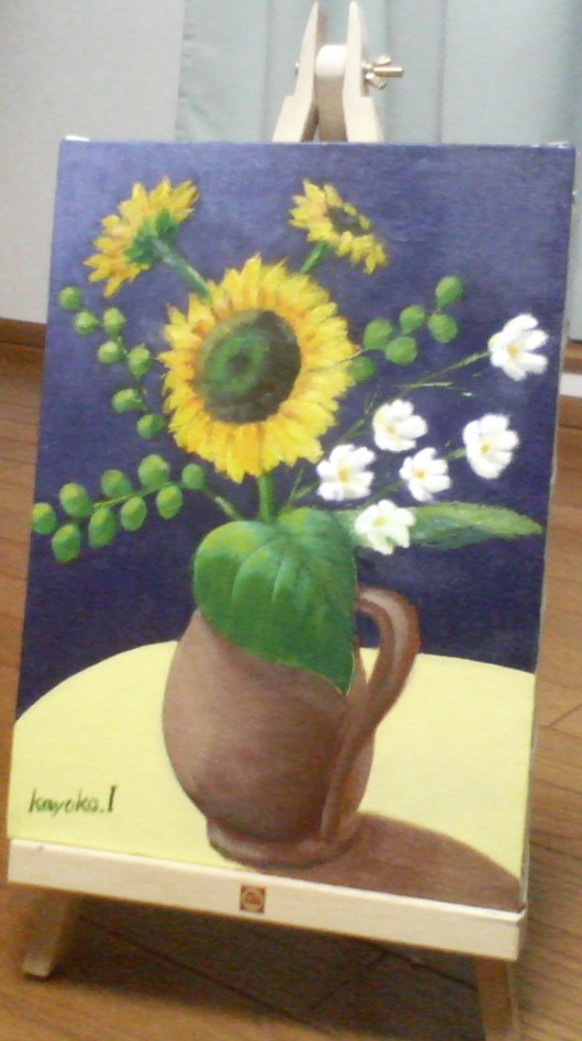 長いお休みがあった人も無かった人もお久しぶり。夏日が続いたと思ったら 今度は雨が続いたりして変な天気だけど5月ボケにはなってないでしょうかw?イロイロ報告したかったんだけど気がついたら前回のupから1ヶ月が経とうとしてるよ、自分。チョコッと前から通い始めた月2回の油絵教室。今日やっと完成したので!!!up!!! 初めて名前を入れる瞬間は超緊張したw。