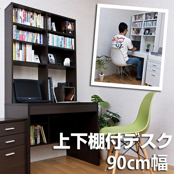 初めてのご利用でもご心配なく♪        【後払い】もご利用いただけます >> 詳細はこちら  商品到着後にお近くのコンビニ 銀行 郵便局でお支払い (手数料324円 上限54000円 ※事前審査あります)  ↓ 大人気!楽天ランキング1位獲得しました♪ ↓       (時間があるものはリアルタイムランキング、他はデイリーランキング)上下棚付デスク 90幅です!A4ファイルや冊子にカタログ、更にはCDやDVDまでもたっぷり収納出来る書棚が上下についてます。学習机、PCデスク、書斎にと様々な用途でご利用いただけます。お揃いのチェストもありますので、あなただけのワークスペースを完成させて下さ