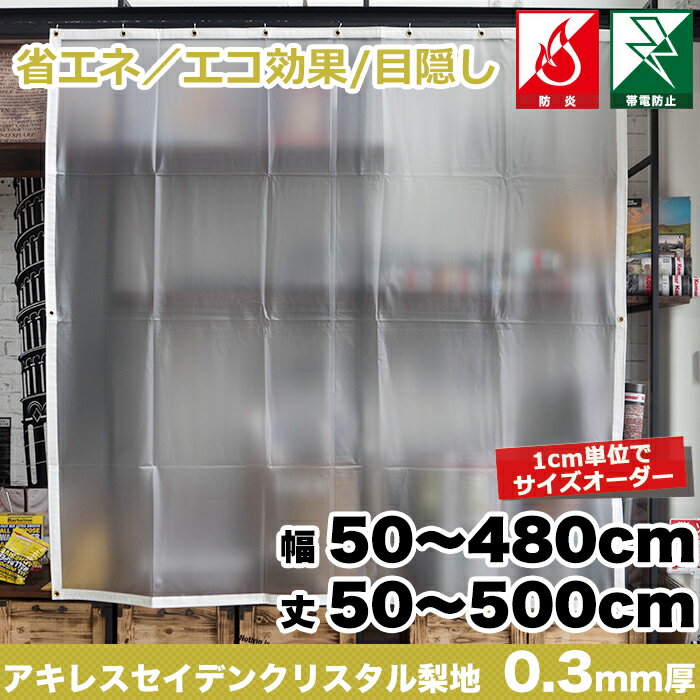 商品名 ■【FT33】倉庫・会社・事務所・店舗・デッキ・ガレージ・ベランダ・お風呂・部屋の間仕切に!/冷暖房効果UP!/節電・防塵・防虫対策に!/ 半透明(不透明) アキレスセイデンクリスタル梨地 PVCビニールカーテン(0.3mm厚) 厚み 0.3.mm カラー 半透明(不透明)/梨地 機能 防炎・帯電防止 材質 PVC(塩化ビニル製) 重量 400g/m2 摘要 ●サイズは幅・丈とも、1cm単位にてお受けいたします。●ビニール製の為、仕上りサイズから1〜2cmの誤差がでる場合があります。ご了承ください。 ●mm単位の指定は出来ません。 ●表記の価格は生地・標準加工賃・消費税込の価格で