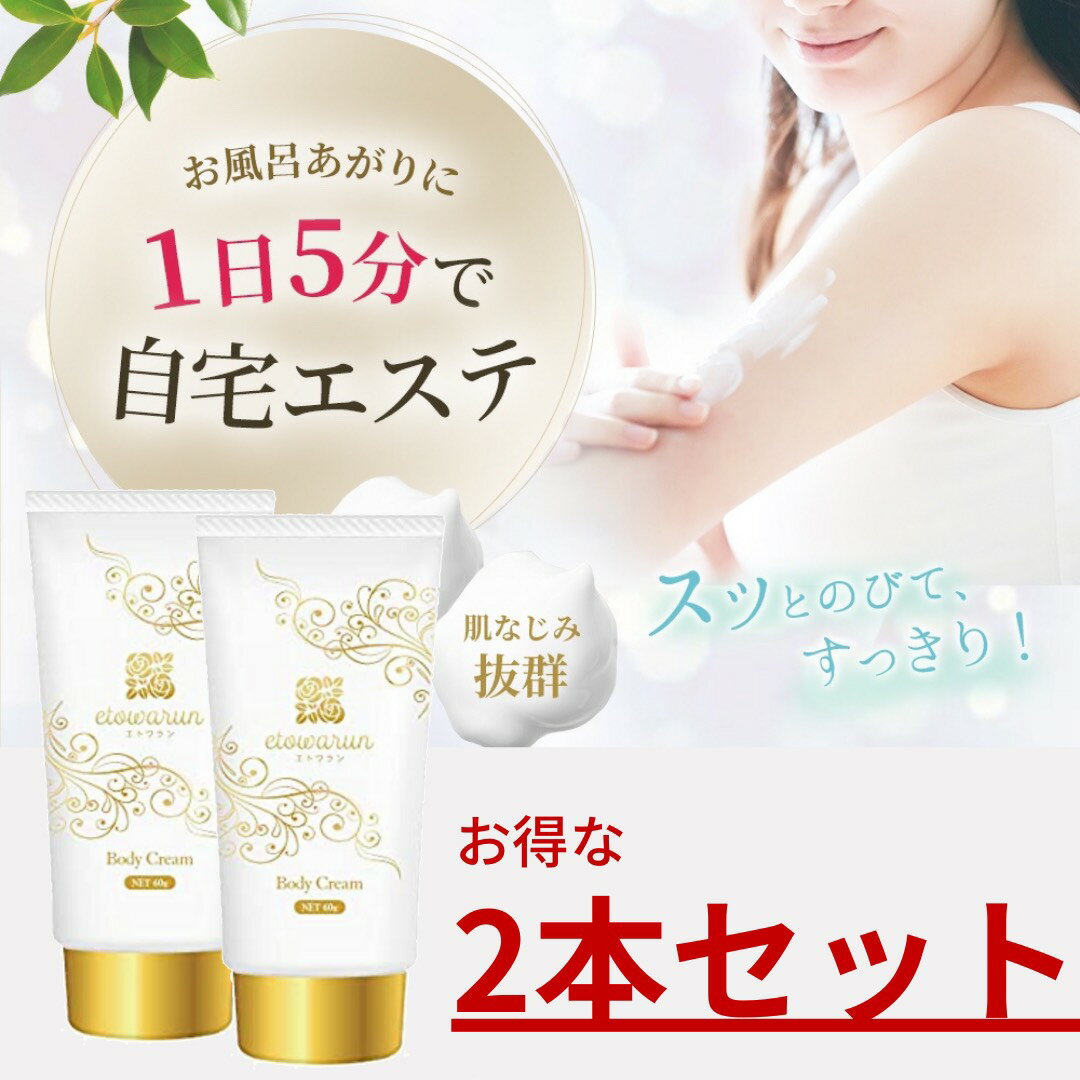 お得な180gセットはこちら 商品情報 商品名 エトワラン 名称 全身マッサージクリーム 内容量 60g 使用方法 お風呂上り時に1日1回、二の腕、または太もも、脚、背中、お腹などのボディ部分にマッサージしながら塗布します。 使用上の注意 お肌に合わない場合はご使用をお控え下さい。 使用期限 未開封で2年間、開封後は個人差や季節的なものもありますが、目安として、1ヶ月〜2ヶ月で使い切って頂くのが理想です。 保存方法 直射日光が当たる場所、高温の場所、湿度変化の激しい場所等は避けてください。 成分 水、グリセリン、トリエチルヘキサン酸ジトリメチロールプロパン、スクワラン、ジメチコン、セタノール、