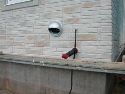 24時間換気排気口この写真の手前に全館空調の室外機が置かれる予定です。この換気フードの付いている部分が、24時間換気の排気口になります。空調室内機や24時間換気装置がこの裏にある訳ではありませんので、頼んで、ここまでダクトで引っ張って来てもらいました。でも、なぜ、こんなことをするかって?それは、全館空調の室外機の効率を少しでも上げてやろう、という試みです。例えば、冬に外気が低い時、この排気口には、室内からの暖かい空気が出て来ますよね。それを室外機に吸わせてあげれば、空調室外機のヒートポンプの効率が上がるじゃないですか。(別に私が考えついた訳ではなく、何かで以前読んだことがあったんです)でも、・空調室外機の通過空気量に対し、換気排気量は、遥かに少ない。・場合によっては逆の条件となる場合もある(夏の夜、外気が下がった時)。・この排気口に出てくる空気温度は、24時間換気に熱交換器が入ってしまっているので、室内温度より多少外気に近い。などで、実際は、おそらく1%の効率改善も望めないと推測しています。24時間換気に欠点の非常に多い熱交換器付きの第1種換気でなく、集中ダクト排気の第3種換気だと、もう少し効果が見込めるかもしれませんね。 24時間排気口用ダクトスペースそれより、室内側には、このようなダクトスペースが陣取ってしまっていて、収納スペースを奥行き含め相当少なくしてしまっています。でも、いいんです、やってみたかった自己満足の試みなので。きっと、こんな馬鹿なことやる人、他にはいないことでしょう(笑)