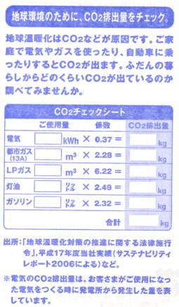 一般に電気やガスは、使用料金だけで判断されがちですが、使用量やCO2排出量がどうか?という点にも着目が必要そうですよね。東京電力の検針票(電気ご使用量のお知らせ)の裏に下のような「CO2チェックシート」なるものが記載されていました。そこで、先日の電気とガス使用量を用いて、CO2排出量を計算してみます。9月分の電気使用量とガス使用量から1ヶ月換算(30.5日間)して求めた使用量は、それぞれ次の通りです。従量電灯B:445kWh、低圧電力:330kWh → 合計775kWhガス:30m3CO2排出量は、次の通りです。電気:775 x 0.37 = 286.75kgガス:30 x 2.28 = 68.4kg電気ガス合計:355.15kg次回の検針では、全館空調の低圧電力が、ほとんど無くなりますので、大分下がりそうです。みなさんのところは、いかがでしょう(^^;