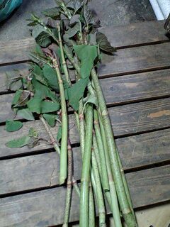 先日、高知の方の採ったイタドリを食べさせていただいた。 これが予想以上の美味しさ! ごま油、醤油と砂糖の味付けだった。 これは自分で採って食べてみないと!ということで採りに行ってきた。 昼から代休を使って島根県南部の奥出雲町(旧横田町)へプラドを走らせた。 船通山という山の麓。 平地では時期が過ぎてしまっているので標高の高いところならあるかも?と思ったのだ。 細い田舎道を走っていたらまずはワラビを発見。 ウキウキ気分で採る。 その後、イタドリを見つけてポキンポキンと折って採った。高知の方の話では軽く折れるくらいのものが食べ頃だとか。 風呂に浸かって松江に帰りさっそく下ごしらえ。 湯をかけて皮を剥いでさっと煮て水につけて酸味抜き。 HPに出ていたとおりにしたが、どうなるかな?