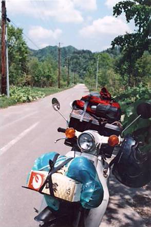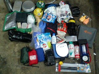 50ccのさぼりマルシェGTに積んだ荷物。 かなりの量だった。 写真には、 調理道具(鍋、飯盒、コンロ、ボンベ、調味料、ナイフなど) 携帯椅子 薬、風呂用品、アルコール、洗濯用洗剤、洗濯ばさみ、水筒 虫除けスプレー バイク用品(チェーンオイル、空気入れ、パンク修理セット、ガソリン携行缶、手袋×3、田植え用長靴、バイクカバー、予備チューブなど) エアー枕、シュラフカバー、ザックカバー 携帯ラジオ ポータブルCD ロウソク、LEDライト数個 などが写っている。 写ってないものは、テント、シュラフ、ロールマット、着替え4日分、水2L、地図×2、米2キロ、工具、合羽、ブルーシート×2、ガムテープ、トイレットペーパー、カメラ、レンズ、三脚…。 あ、あとパック酒2L…。 時にはキャベツや長芋がぶら下がってたことも。 とにかく荷物が多すぎた。 要らない工具もたくさんあったし…(風の旅人さん、 したひろさん からの指摘♪) 来年は荷物を減らして、サイドバックの取り付け、レッグシールドキャリアなどを考えよう! まあ、初めてのバイクツーリングだからいいかな? 課題の多いツーリングだったことには間違いない…。