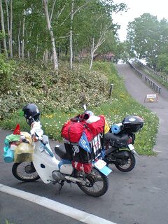 海別の展望台から下ってきた幾三。 ふと見るときれいな稜線の斜里岳! 麦畑の緑もきれいだ。 斜里岳はかなり好きな山。 去年、斜里岳林道を走って近くから見たがその姿は遠くから見るものとはまた違ったよさがあった。(去年の斜里岳林道) 斜里の道の駅に寄る。 ここはネットが自由にできて天気予報などの確認に最適♪ 駐車場にバイクを停めると同じ年くらいの2人がいた。 1人は鳥取から。 同じ山陰だ~! 北海道走ってても滅多に会わない山陰人。 なんか嬉しい。 そしてもう1人は東京から来たという日本一周中の原付ライダー! すげぇ…。 俺なんかフェリー使って北海道走ってるだけでいい気になってるのに…。 しばらくして鳥取ライダーは行ってしまった。 原付ライダーとなんやかんや話していると走る方角は同じらしい。 一緒に走るか!ということになり、国道334号を走る。 途中、一緒に給油して…。 そのうち、今夜は同じところで泊まろう!ということになる。 食料調達のため、小さな商店に入るがたいしたものはない。 浜小清水の道の駅まで走った。 コンビニのようなスーパーのような店があったので酒と食料を買出し。 ここの店のおっちゃんがなかなかいい感じで3人でかなり盛り上がった。 手ごろな東屋があった。 今夜はここで寝よう!と準備を始めた2人だった。