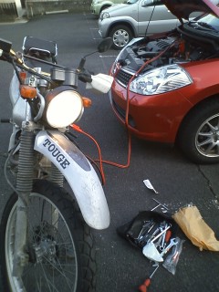2月22日。 久しぶりに動かそうとしたSL230。 SL230、初乗り失敗… しかし、セルが回らず断念。 昨日、仕事が早く終わったので、車につなげて復活を試みました! なんとかエンジン始動。 久しぶりの振動でバイクから乾いた泥が落ちてました…。 掃除して冬を越せばよかった(もう一回くらい乗ろうと思っていたのですが、今年は寒かった…)。 近所をぐるりぐるりと何周か走ってエンジンを止めました。 次乗るのはいつになるか…。 また車と繋げることになりそうな予感…。
