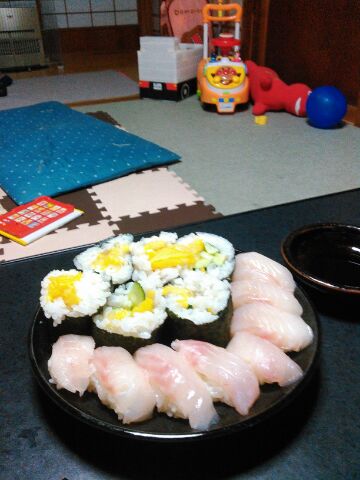 一昨日、急に寿司が食べたくなって。 昨日は我慢して、ようやく今夜、寿司を作りました~。 アナゴのちらし寿司と、グレの握り、沢庵ときゅうりの太巻。 粒男もちらし寿司をパクパク食べました。 幾三はグレの握りを堪能。 旨かった~! 最近、ちょっと寿司食べたいな~と思ってスーパーの握り寿司を買ってもワサビが入ってませんよね。 ネタをめくって自分でワサビをつけて食べないといけません。 子供も食べやすいようにしているのかわかりませんが、なんか納得できません。