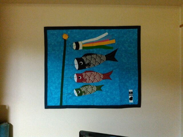 もうすぐ5月5日。 松江は旧暦なので6月にするようですが、10年以上住んでいてもイマイチしっくり来ないので我が家は5月にします。 ようやく、「鯉のぼり」ならぬ、「鯉のぼりのパッチワーク」を居間に飾りました~。 忙しくてなかなか飾れなかったのですが、幾三の母(粒男のばばあ)の手作りです。 粒男が生まれた去年の春、「鯉のぼりあげるベランダは無いし…」と話していたら縫ってくれました。 80cm×90cmというなかなかの大きさ。 そういや昔、おかんは肩が凝るなんて言いながらいろいろ縫ってたな~なんて思い出したり。 明日の朝、粒男に見せたいと思います~。