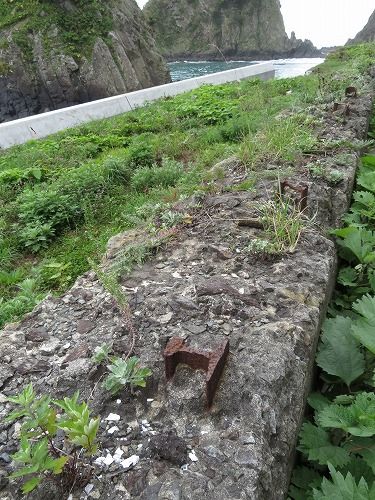 朽ち果てた防波堤のようなコンクリートの中にレールが!