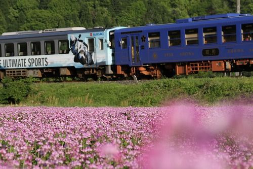 若桜鉄道沿線で写真を撮ろうと思い、レンゲ畑を見つけて構えましたが思ったよりも早く列車が来てしまい中途半端な一枚。