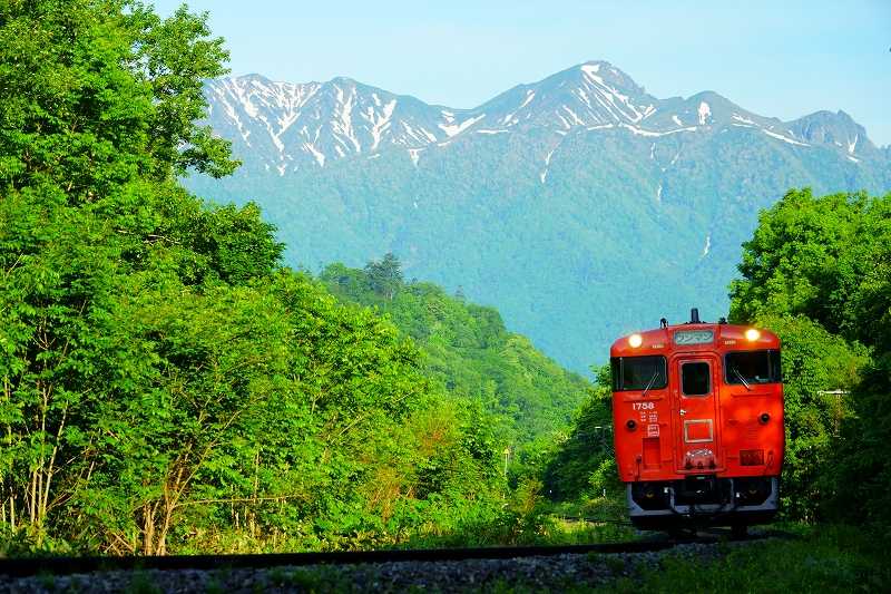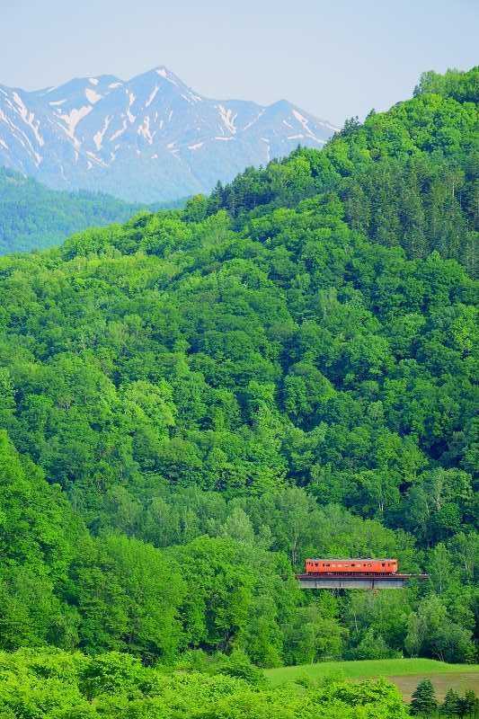 次は東鹿越から富良野へ向かう列車をかなやまダムの上から芦別岳と。