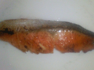 日記4日目です。さすがに、もう続かない気がしてきました・・・多分今日明日で一時休止をしようかな。気を取り直して、今日は仕事が終わってから、昨日宣言した通り、単身赴任してから「初☆魚料理」をしました。「魚料理」といっても、塩鮭をフライパンで焼いただけだけど・・・しかも、塩鮭1枚買うのに、わざわざ妻に「魚焼き機ないけど、フライパンで塩鮭焼けるよね?」と電話で確認をとり、「バターで焼いたらおいしいよ。」とアドバイスを受けてから、1枚78円(安い!!)の塩鮭を買って帰りました。家に帰って、妻に教えてもらった通り、「バターで焼くと・・・」これが「うまい」やみつきになりそうです。これでレパートリーが増えました。 余りにもおいしかったので、写真を掲載します。明日は、残っているゴーヤを使ったゴーヤチャンプルにしようかな。