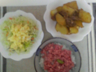なんとこの日記が1週間続きました。生まれてこの方、小学生の頃の夏休みの宿題の絵日記以外、日記を書いた事がないのに自分でもびっくりです。 さて、今日は朝から、会議やMTで慌しい1日を過ごしました。夕方17:30からは、出張先でのMTを実施してそのまま直帰した為、いつもより早く家に帰ってきました。 今日の晩飯は、昨日の宣言通り、肉ジャガをつくりました。後は、半額で買ったまぐろのたたきを使った(ネギ)トロ丼?ネギはないけど・・・とサラダ。肉ジャガは、にんじんを入れるのを忘れましたが、すごくおいしく仕上がりました。 単身赴任を始めてからは、外食をすると癖になると思い、出張や飲み会(月に1回程度)以外は、毎日自炊をしています。 結構料理もさまになってきたような気がします。