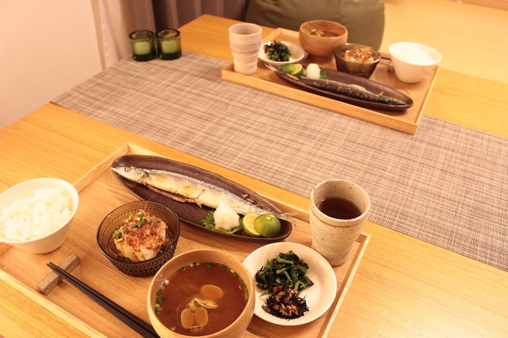 こんばんはきょうはさんまを焼きました~いつもは魚を焼く天板そのままを机にどーんと置いてそのまま食べるわけですが(笑)blog用にはそうもいかないので御膳のように、かぼすまで買ってきましたよ漆器とキッチン 祭りのええもんさんのトレーも届いているので早速使ってみました新鮮なさんまだったので内臓を取らなくても良かった。。(後から知った。)というのも、サンマには胃がなく消化管は1本の管になっているので食べ物が体の中に入っても30分ほどで消化してしまうのだとか。なので体の中にたまらず外へ外へと出ていくので新鮮なさんまなら内臓も食べれちゃうわけです。しかもさんまのはらわだには栄養があって「レチノール」という美容効果の高い成分も入っているのだとかレチノールはコラーゲンを増やしたり、粘膜を強くする働きがあるので口元目元のシワやたるみ・・・・を改善してくれるそうですそんなことならそのまま焼けばよかった~!!(しかも包丁入れすぎて見栄えが・・・・・)そしてそして、ずーっと揚げ物が続いていたのでちょこっと常備菜を作りましたひじき煮ほうれん草の韓国風ナムルほうれん草の韓国風ナムルはほうれん草をさっと湯がいて、水気を切って韓国のり、ごま油、ごま、塩を加えただけの簡単なものヘルシー思考で今回はごま油は省きました(無かったともいう)また海苔がほうれん草の水気を吸ってくれていい塩梅になります。 今日のメニューは、あさりのみそ汁、ほうれん草のナムル、ひじき煮、冷奴でしたごちそうさまでした♪手作りおうちごはんおうちごはん毎日のごはん料理、クッキングランキングに参加しています~1クリック応援よろしくお願いします~ ↓にほんブログ村