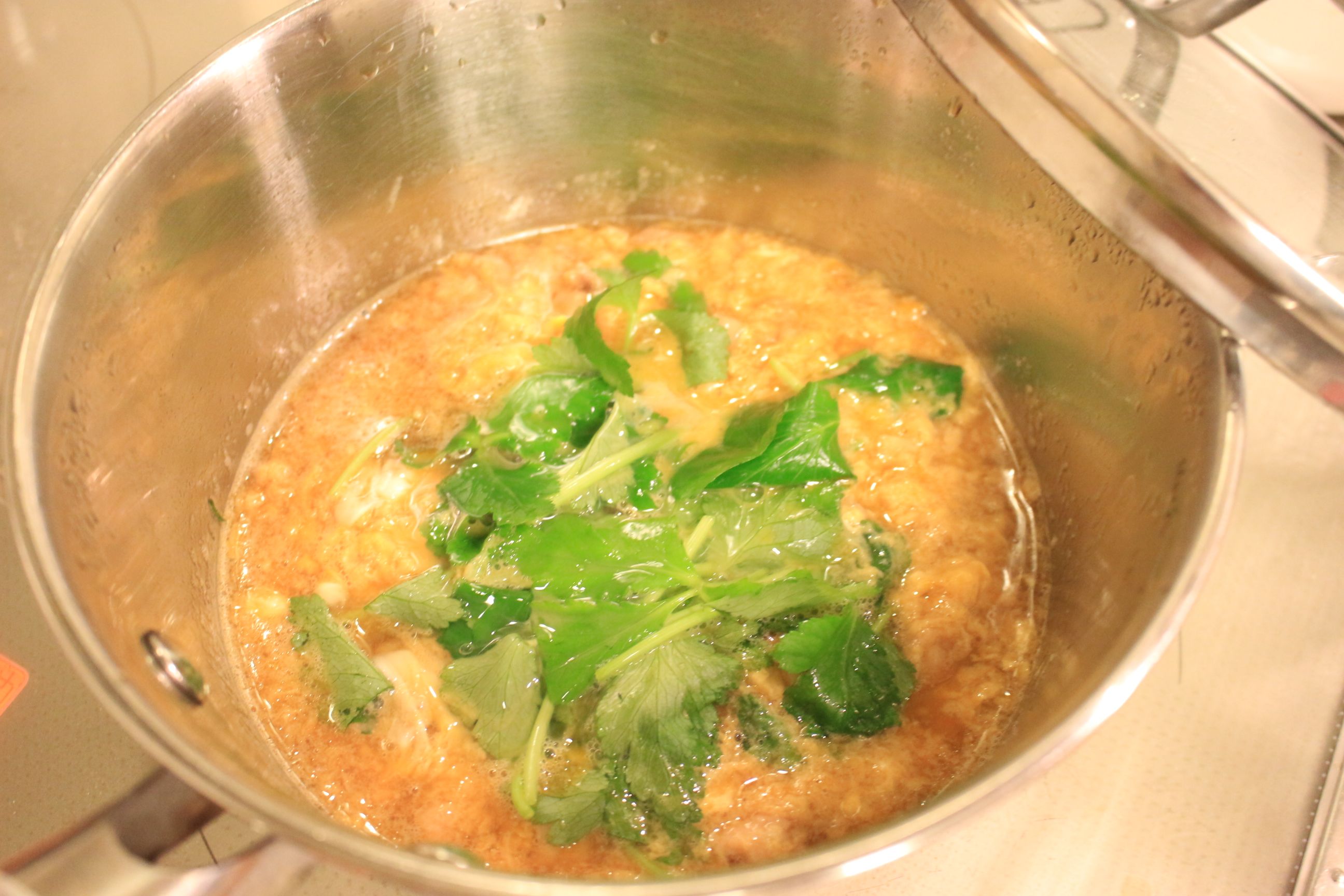 卵と三つ葉を入れるタイミングは同じで、