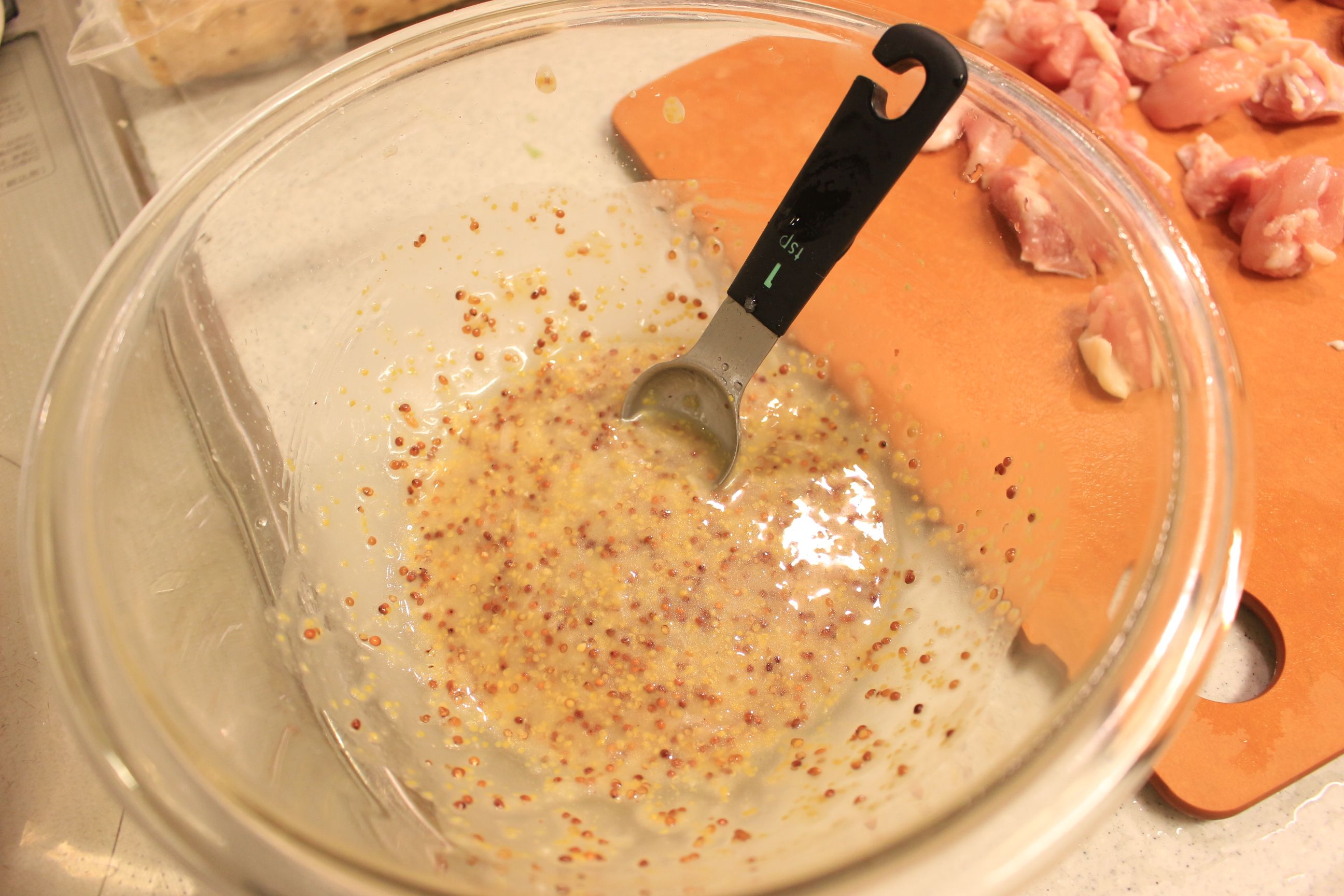粒マスタード、酢、玉ねぎのすりおろし、にんにくのすりおろし