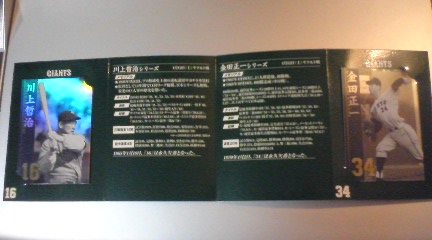 こんばんは☆今日は、4月12日に永久欠番シリーズとして東京ドームで配布されたカードを紹介します。08 巨人球団配布 永久欠番シリーズ 川上哲治 (提供可能)08 巨人球団配布 永久欠番シリーズ 金田正一 (提供可能)2枚ともインサートのよぅに光ってぃます!とてもきれぃなカードです(^_^)とりぁぇず2枚とも提供可能です。では、また!