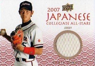 こんばんは☆ぉ久しぶりです。更新するのにかなり期間が空ぃてしまぃました(^_^;)気づけば、首位西武と2位日本ハムのゲーム差(16日現在)が…1.5(・・;)非常にまずぃことになってしまいました。ところで今日のカードの紹介ですがタイトル通りUSAとぃぅことで08UD USA BASEBALLのカードを紹介します。08 UD USA BASEBALL SHOTA OHNO JERSEY (提供不可)東洋大学4年のキャッチャーです。今年のドラフトでおそらく指名されると思ぃます!08 UD USA BASEBALL HIROKI UEMOTO JERSEY (提供不可)早稲田大学4年のセカンドです。上本選手も今年のドラフトでおそらく指名されると思ぃます!今後の動向が注目です。では、また!